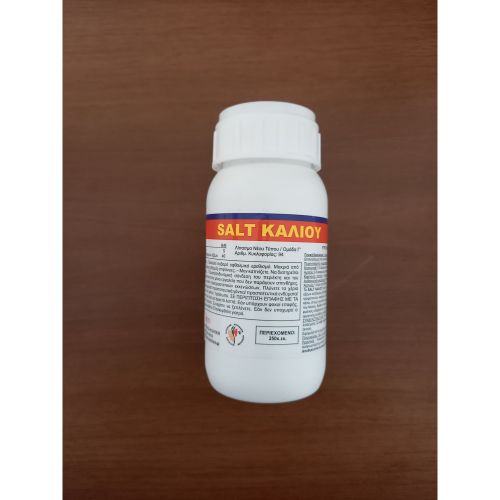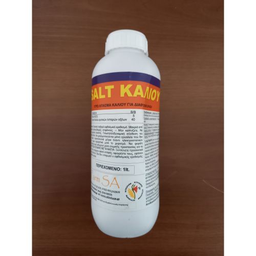 Το SALT ΚΑΛΙΟΥ είναι ένα υγρό λίπασμα Καλίου σε μορφή καλιούχου άλατος φυτικών λιπαρών οξέων. Διαθέτει τασιενεργές ιδιότητες λειτουργώντας ως φυσικός διαβρεκτης που βοηθά στην είσοδο των ιόντων Καλίου στο φύλλωμα . Βελτιώνει τα ποιοτικά χαρακτηριστικά των καρπών και του φυλλώματος , ενισχύοντας την άμυνα των φυτών ιδιαίτερα σε προσβολές εντόμων και ακάρεων . Λόγο της ειδικής του οργανικής σύνθεσης το SALT ΚΑΛΙΟΥ συντελεί στην απομάκρυνση των μελιτωμάτων (προέρχονται από τη δράση μυζητικών εντόμων) από τα φυτά . Το SALT ΚΑΛΙΟΥ εφαρμόζεται με ψεκασμό και είναι κατάλληλο για οπωροφόρα δέντρα , κηπευτικά , αμπέλι ,και ανθοκομικά είδη .